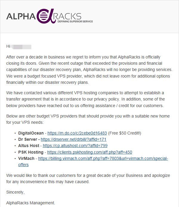 AlphaRacks  这个灵车VPS商家,在经历网络供应商拔网线事件后,终于跑路了。