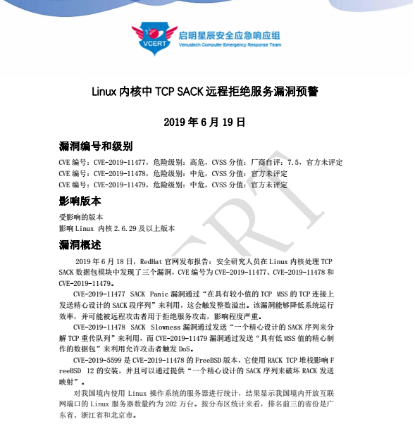 2019 年 6 月 18 日,RedHat 官网发布报告:安全研究人员在 Linux 内核处理 TCP SACK 数据包模块中发现了三个漏洞,CVE 编号为 CVE-2019-11477、CVE-2019-11478 和CVE-2019-11479。