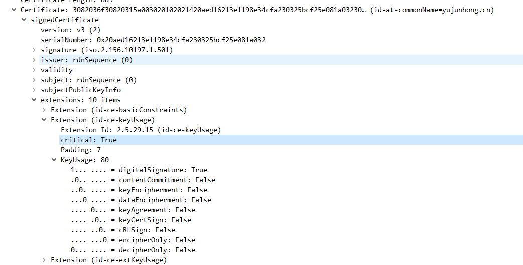 服务器的加密证书:加密证书中在同样在扩展字段中KeyUsage标识出KeyEncipherment为true和dataEncipherment为true,即数字证书中包含的公钥可用来做密钥加密密钥和数据密钥。