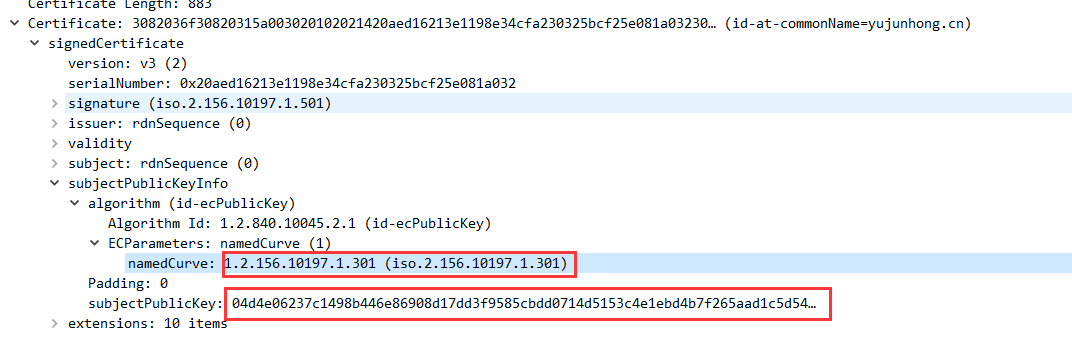 具体公钥信息包含subjectPublickey公钥数据信息和算法名称,例如这里就是使用公钥04d4e......采用iso.2.156.10197.1.301也就是SM2算法进行加密操作。