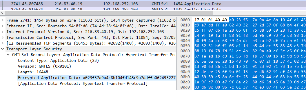 之后开始加密通信,SSL/TLS/TLCP在通信过程中提供机密性、完整性保护。具体来说,先对消息明文M生成MAC然后将M和MAC一起进行加密传输。所以这里我们看到应用数据就是一个加密后的密文字符串。