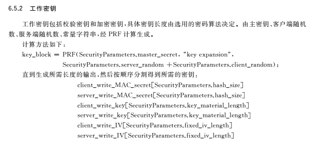 工作密钥的长度由选用的密码算法决定,由主密钥、客户端随机数(随机数1)、服务器端随机数(随机数2)、常量字符串经PRF计算生成。其中主密钥由预主密钥、随机数1、随机数2、常量字符串经PRF计算生成。在这个例子里,数据加密算法使用SM4-CBC,所以用于数据加密的密钥长度为128bit。完整性保护使用HMAC-SM3,SM3分组长度为512bit,所以用于验证完整性的工作密钥长度为512bit。