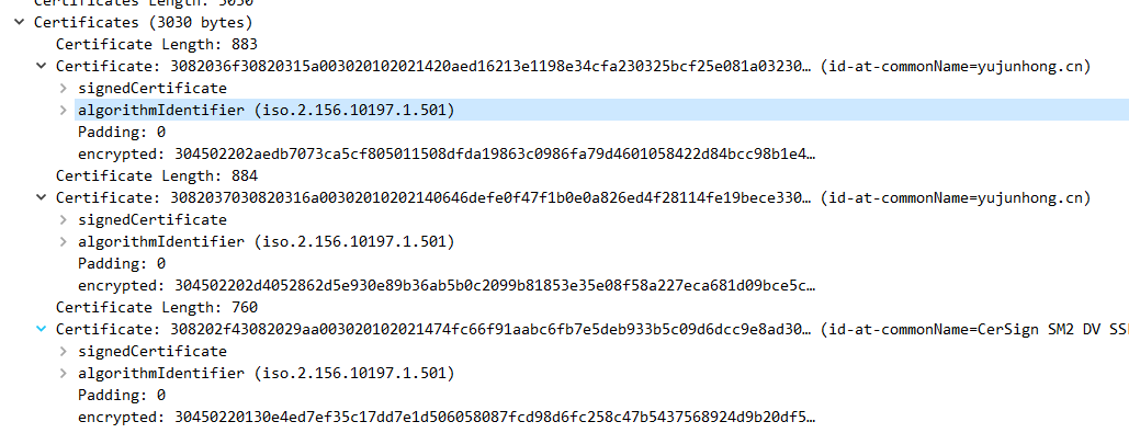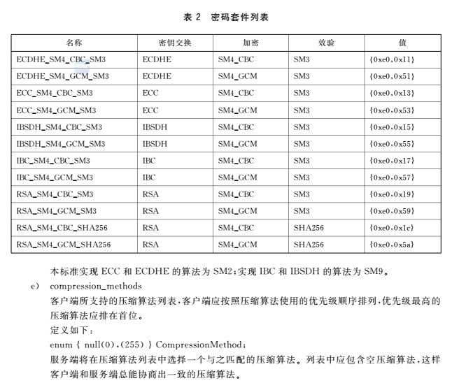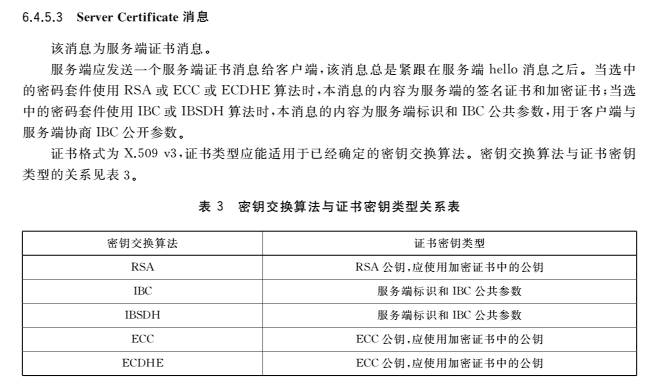 使用的密码套件清单-Cipher Suite,这里服务器端选择了ECC_SM4_CBC_SM3密码套件,也就是SM2公钥算法、SM4-CBC分组密码算法和SM3杂凑算法。具体来说,这里SM2算法密钥交换算法,SM4是加密算法(SM4-CBC)、SM3是校验算法(国标要求为HMAC-SM3)。