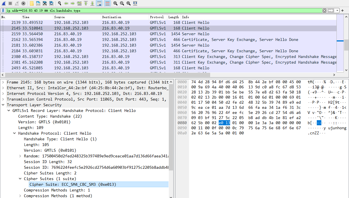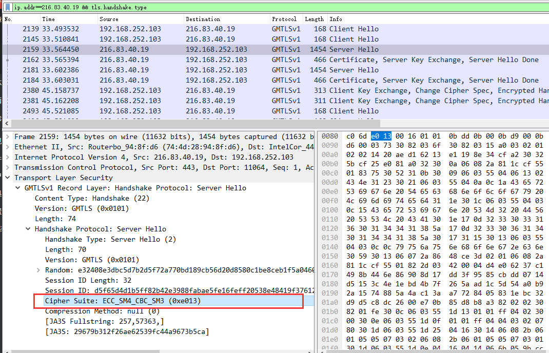 可用的密码套件清单-Cipher Suites,这里使用的是国密浏览器所以可以看到支持的国密算法为0x013 ,在 《GB∕T 38636-2020 信息安全技术 传输层密码协议(TLCP)》中有相关定义。服务器端将在依照这个列表选择本端支持的算法进行回复确认。