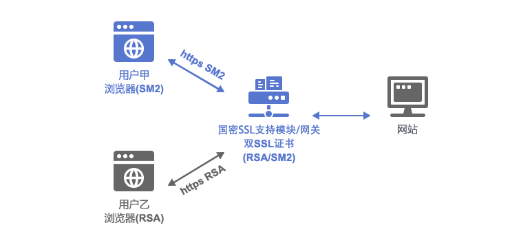 当用户通过Chrome、FireFox、Edge、Safari等主流浏览器访问本站点时,系统自适配ECC国际算法SSL证书。当使用基于国密算法的如密信等访问支持国密SSL证书的浏览器访问本站时,优先建立国密HTTPS连接。
