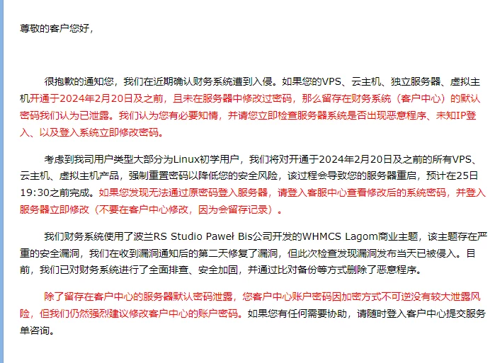 随后紧急登录云主机后台修改密码。随后恢复了博客的运行。昨日主机提供商发来邮件解释原因,原来是云主机商自己被黑了。。。